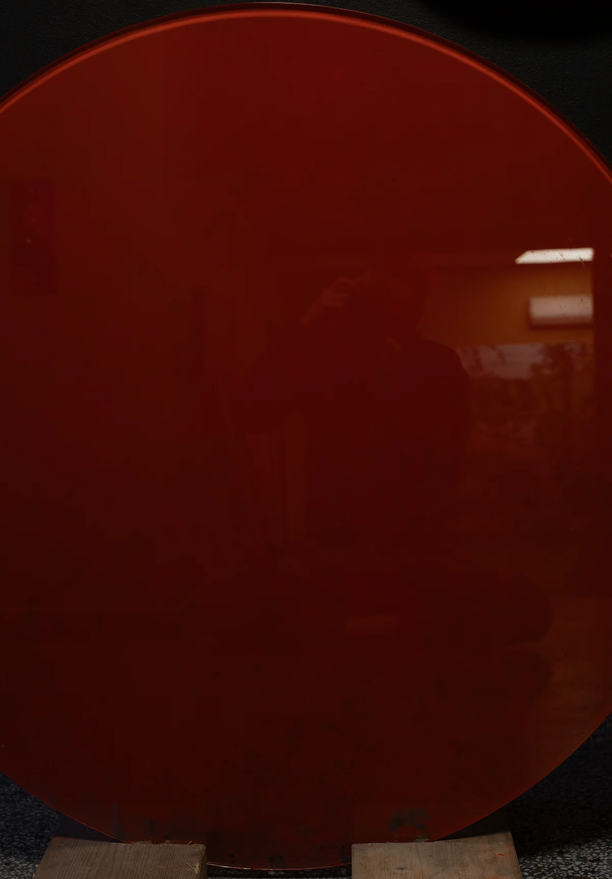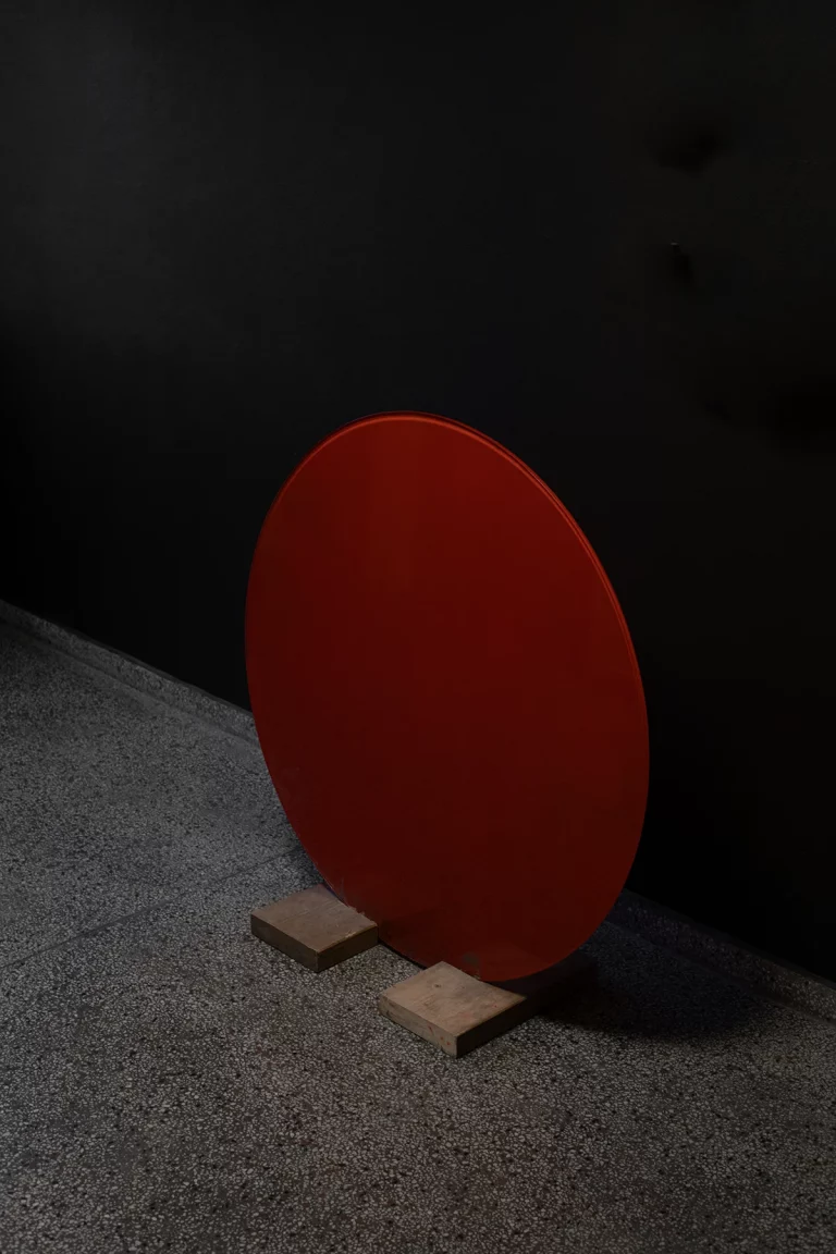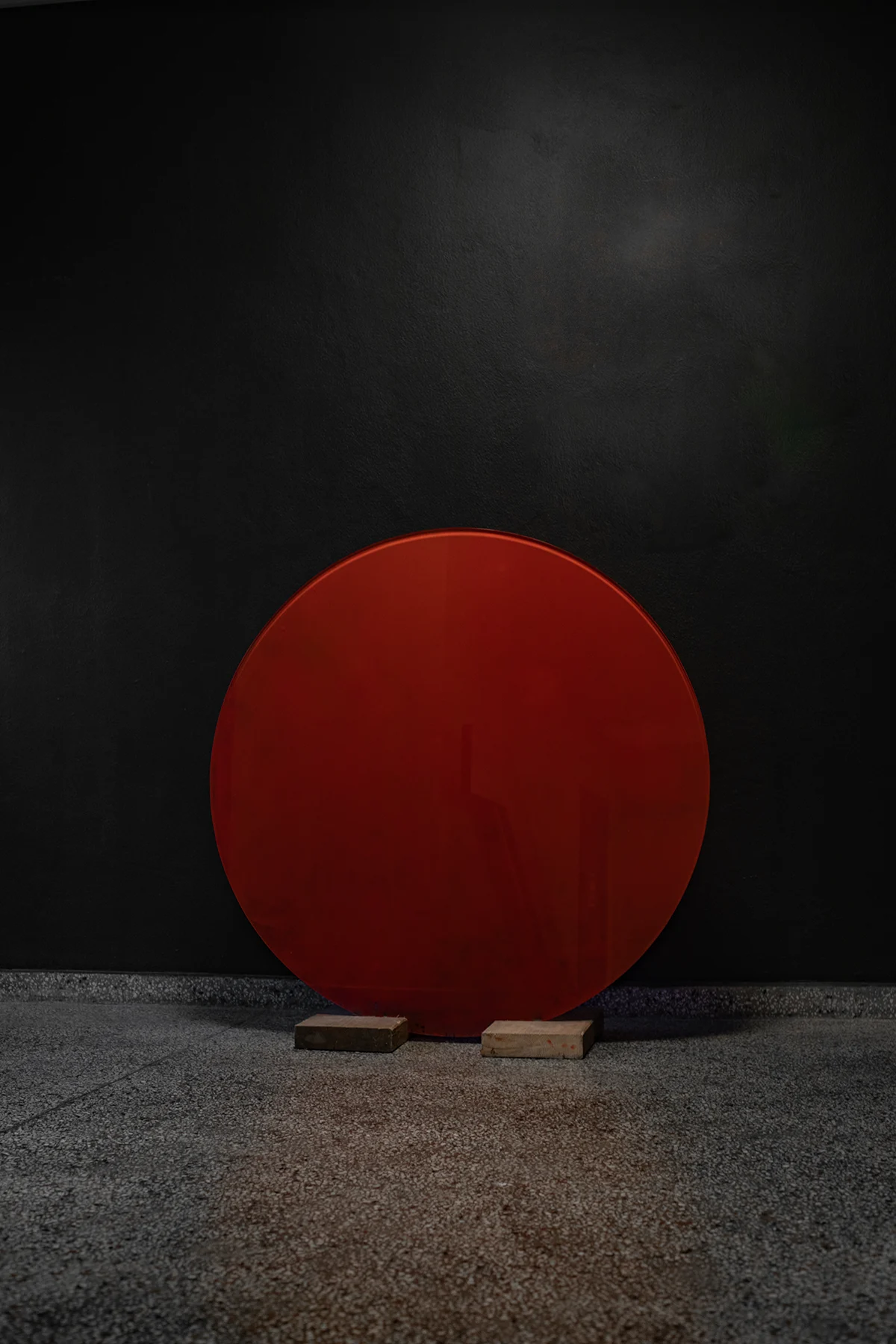 En sirkulær rute av floatglass, Ø 110 cm, 1 cm tykk, malt rød på baksiden.To rå treklosser som støtter – eller ganske enkelt gulvet eller veggen – er tilstrekkelig.