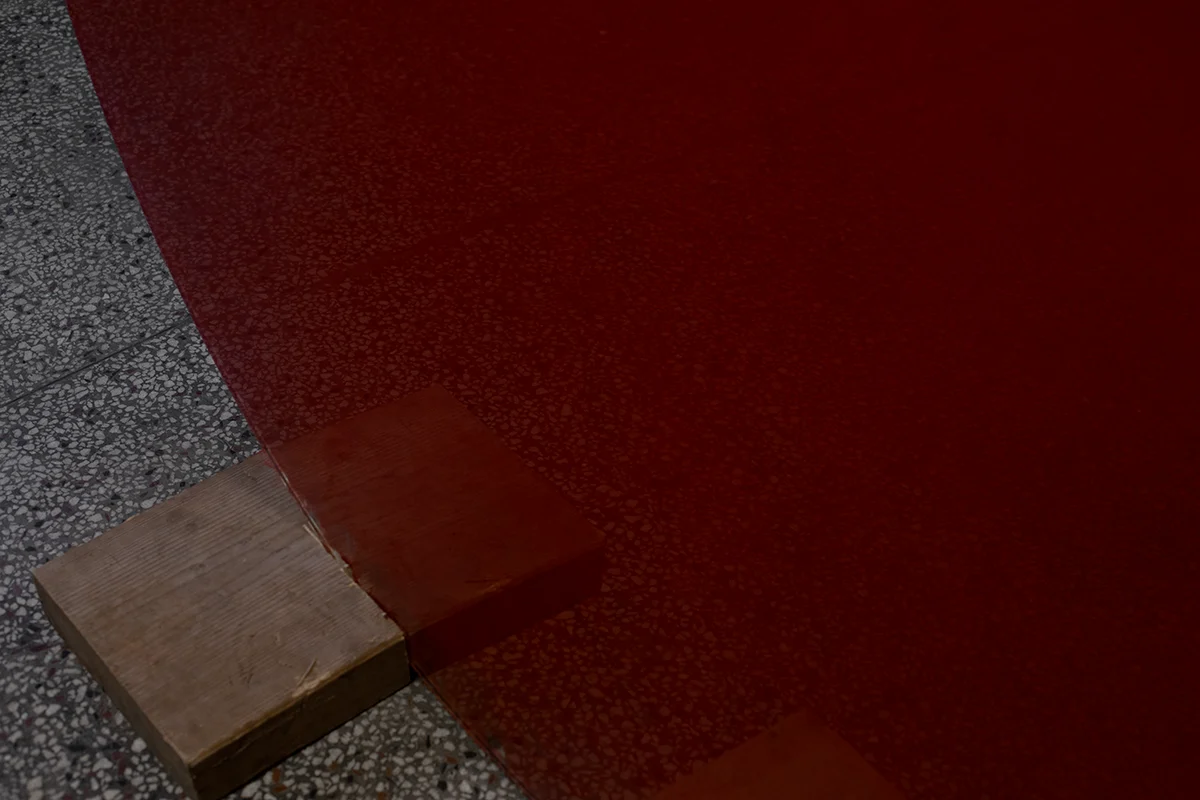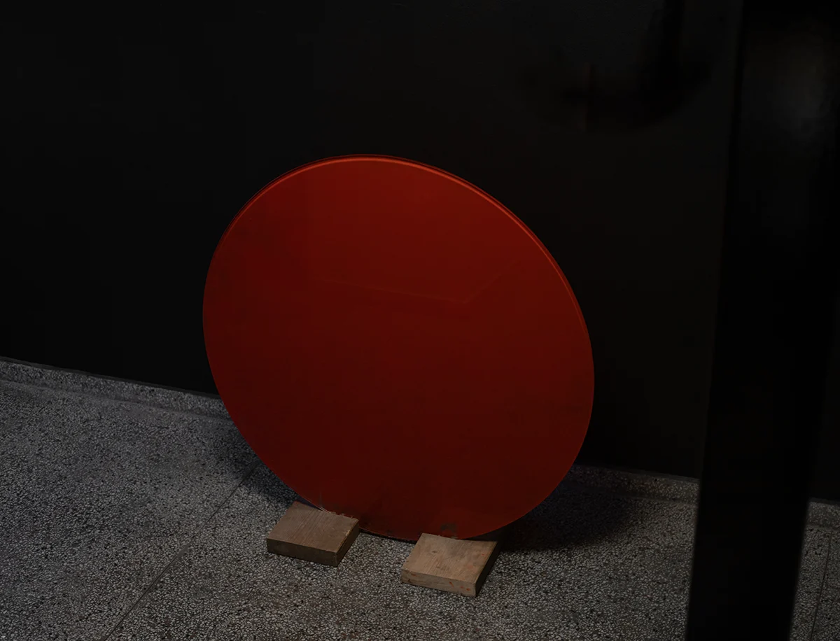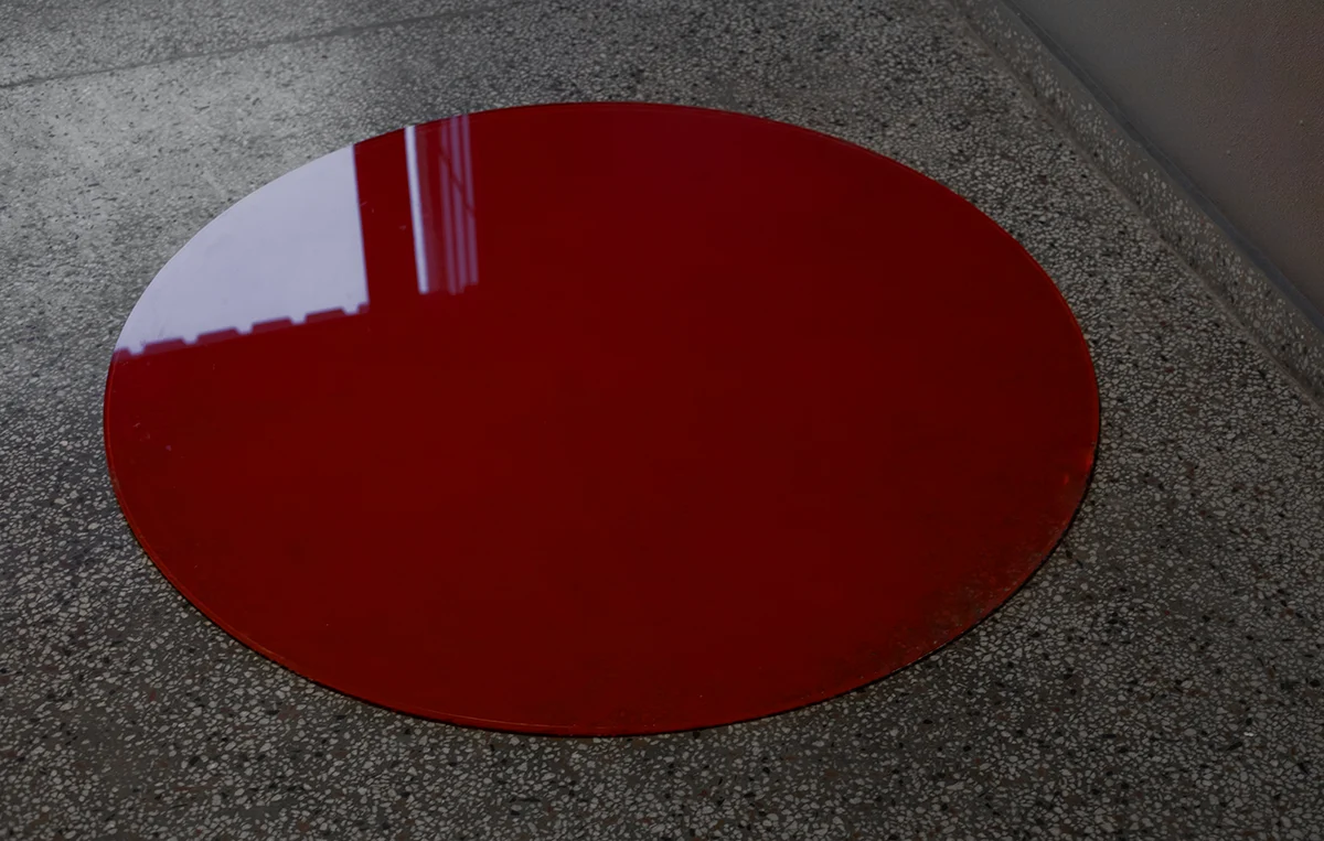 En sirkulær rute av floatglass, Ø 110 cm, 1 cm tykk, malt rød på baksiden.To rå treklosser som støtter – eller ganske enkelt gulvet eller veggen – er tilstrekkelig.