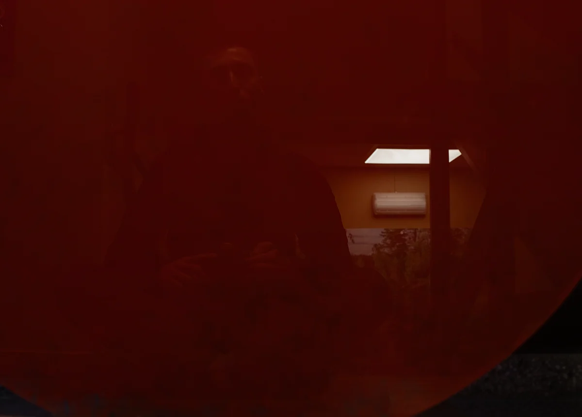 Refleksjonen på displayet avslører et selv uten dybde, uten temperatur. Den røde glassoverflaten til Two Bodies utfører en mild korrigering – ikke en moralsk innvending, men en fysisk motvekt.