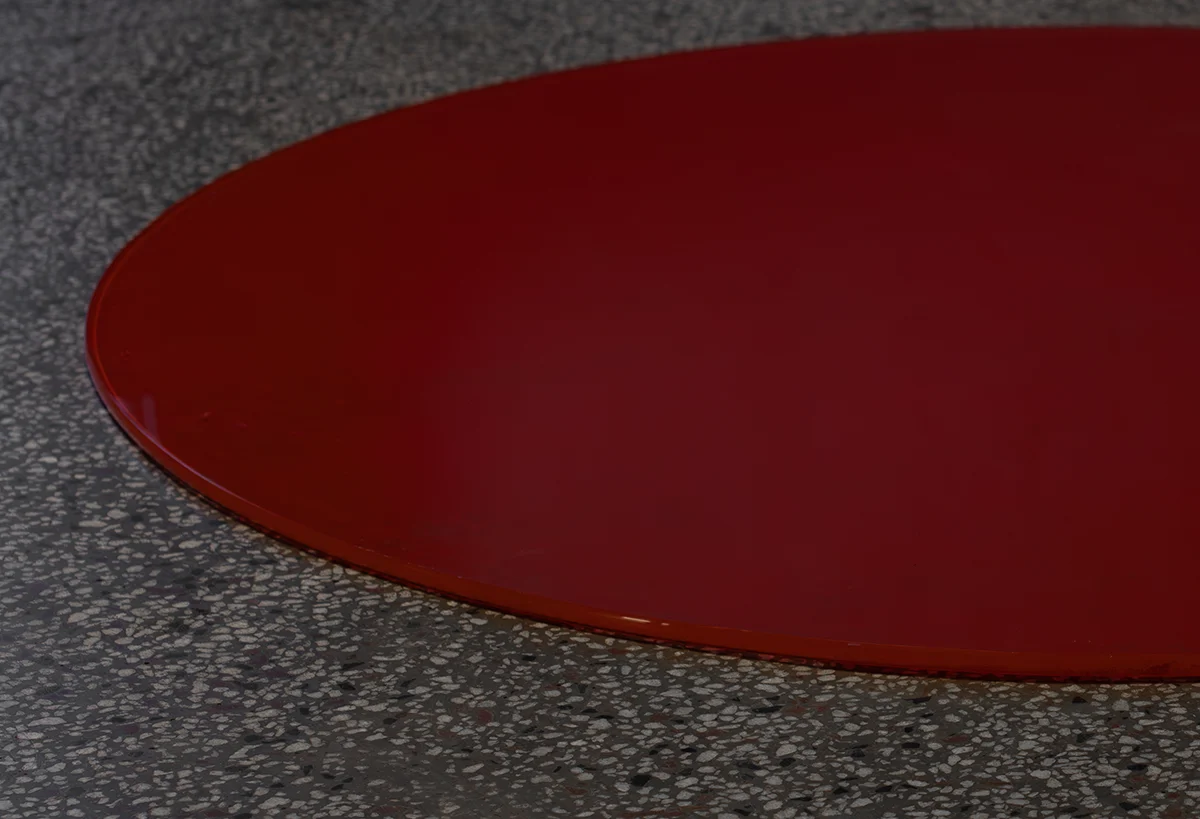 Eine kreisrunde Floatglasscheibe, Ø 110 cm, 1 cm stark, rückseitig rot bemalt.